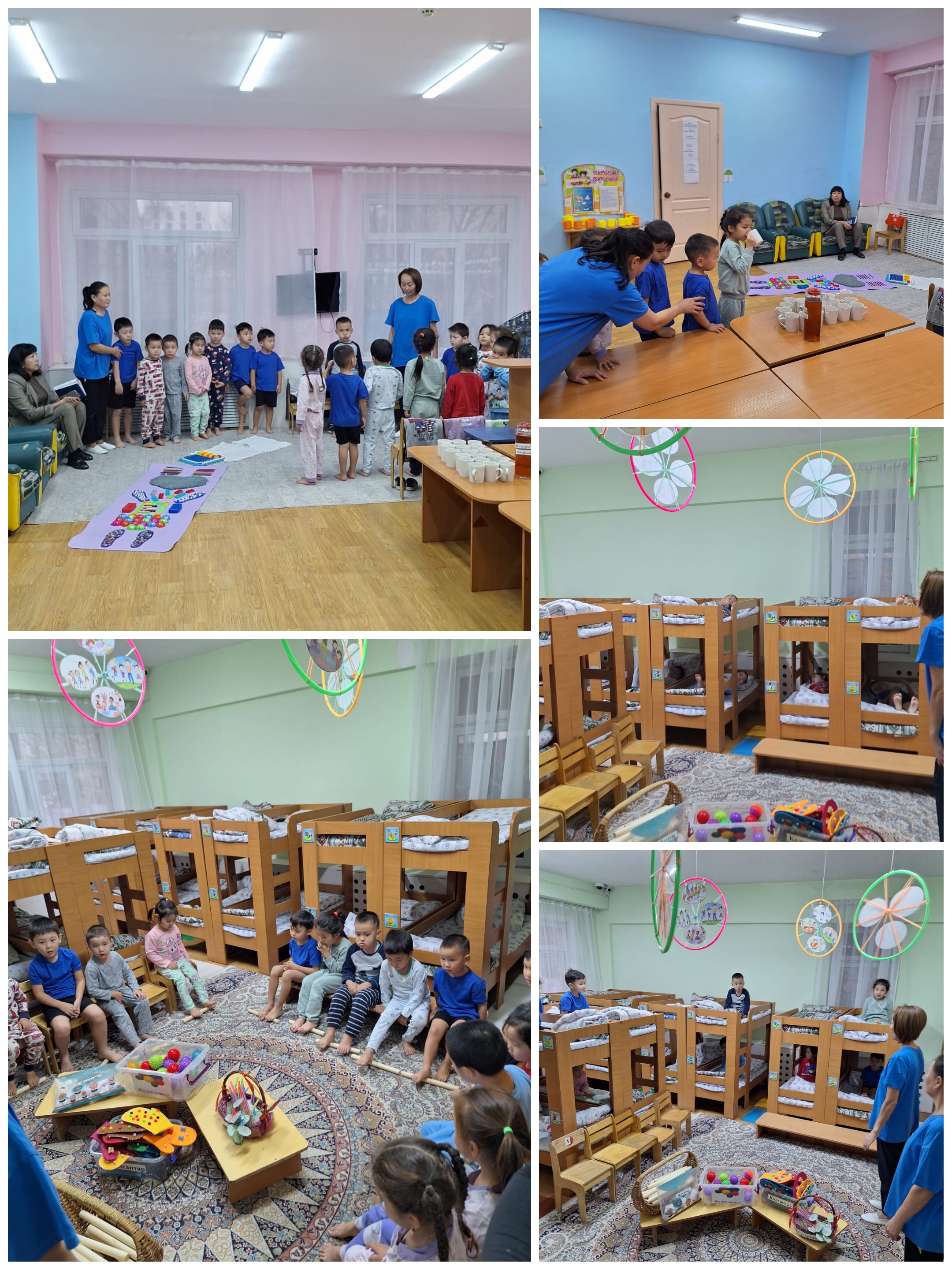 Мақсаты: Балалардың дене бітімдерінің дұрыс қалыптасуына, қан айналымының жақсартуына, көздерін дем алтуға, балалардың арқалары, қолдарындағы, табандарындағы нүктелерді оятуға арналған жаттығуларды жасату. Суық тиюге және майтабанға қарсы жаттығулар жасау арқылы балалардың денсаулығын нығайту, дене сымбатын жетілдіру, қимыл - қозғалыс дағдыларын дамыту. Балалардың көңіл - күйін көтеру, мәдени - гигиеналық талаптарды орындау, тазалыққа, ұқыптылыққа тәрбиелеу.