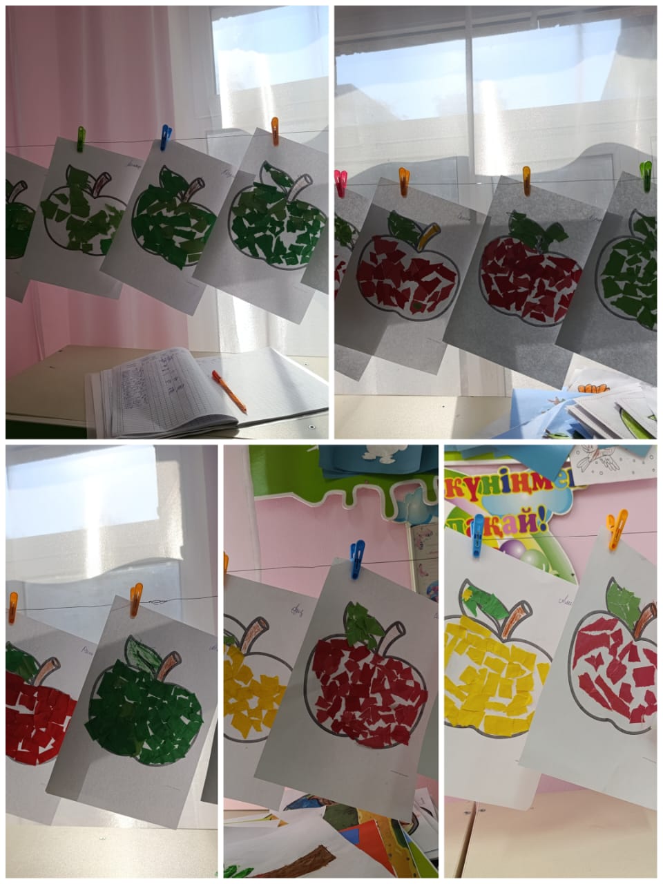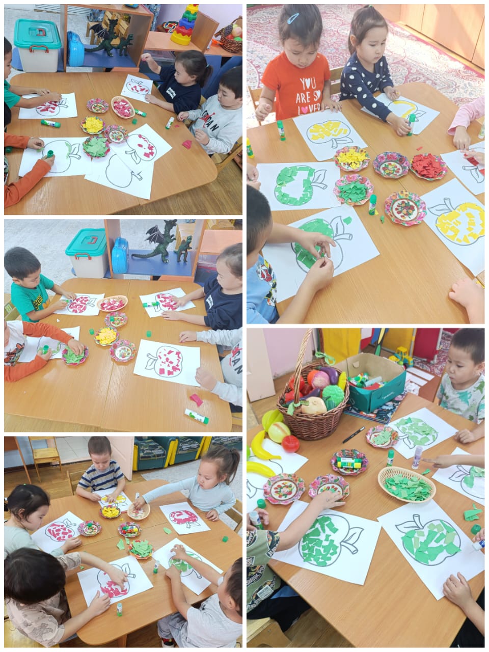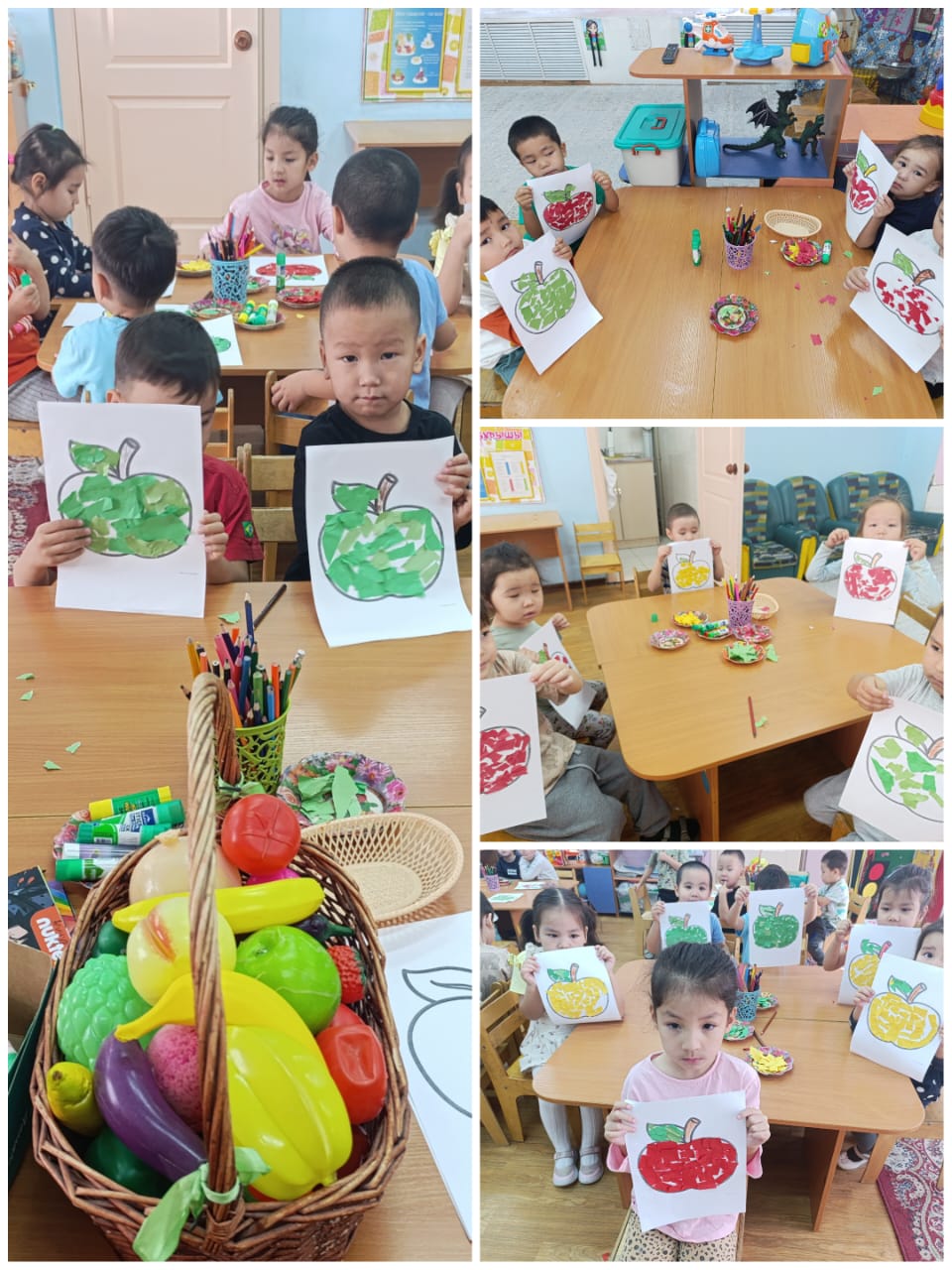 Ұйымдастырылған іс- әрекеті: «Жапсыру» Тақырыбы: «Алма» Мақсаты: балаларға қолмен жырту әдісін үйрету, жемістерді айыра білуге, бейнені дұрыс орналастырып, кеңістікті бағдарлай білуге, түстерді таңдай білуге үйрету